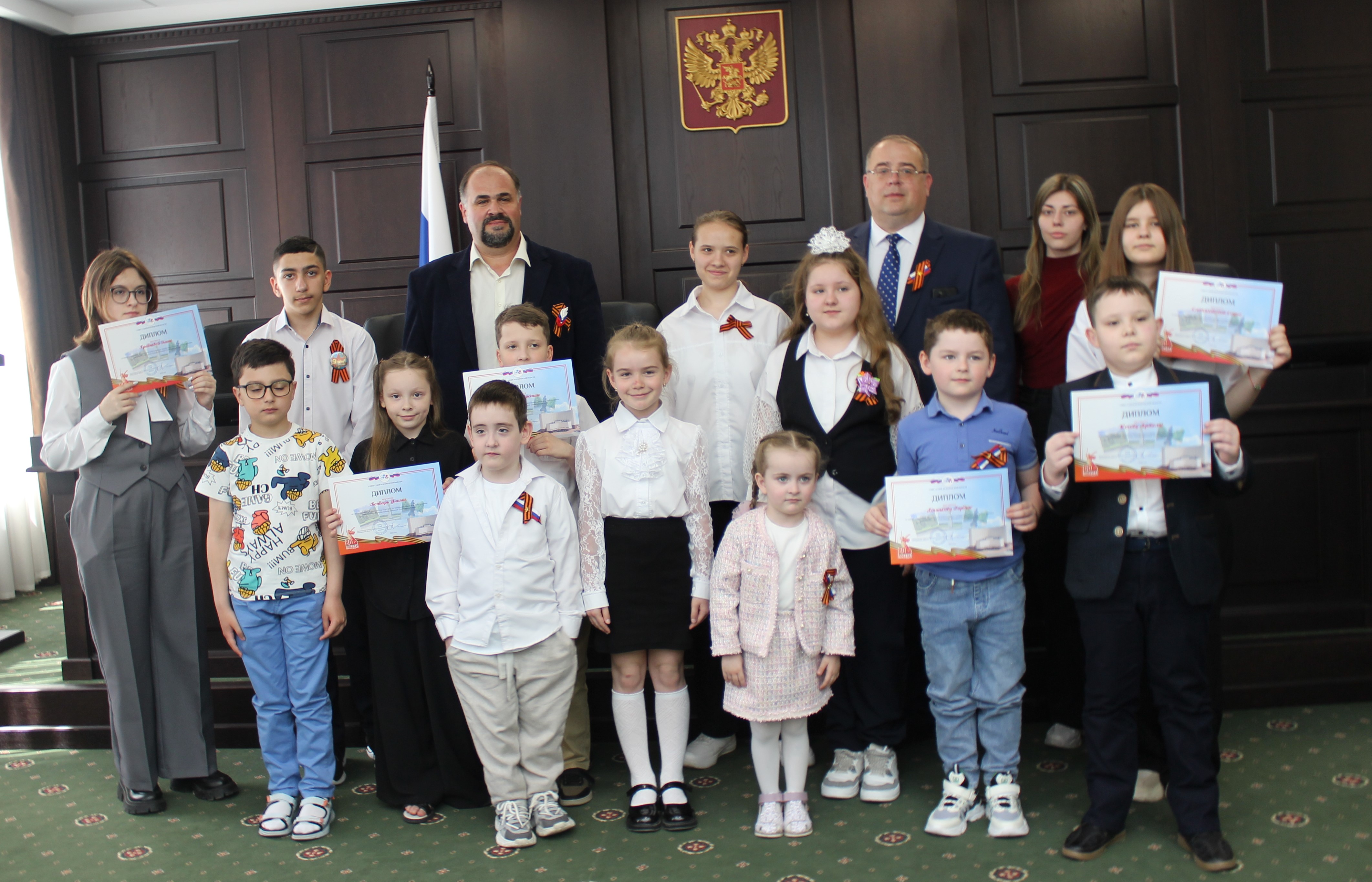 25 апреля 2025 года в зале Совета судей Белгородской области состоялось торжественное награждение победителей и призеров детского творческого конкурса рисунков Совета судей Белгородской области, посвященного 80-летию Победы в Великой Отечественной войне. Конкурс был ориентирован на детей судей и сотрудников аппаратов судов Белгородской области и проводился в нескольких номинациях. Всего было заявлено 78 творческих работ. В конкурсе приняли участие и стали победителями и дети сотрудников аппарата Ивнянского районного суда – Саркисян Александр и Якшина Софья. При награждении призеров и победителей конкурса заместитель председателя Совета судей Белгородской области Коцюмбас С.М., председатель Совета судей Белгородской области Сапронов А.Н., члены Совета судей отметили, что данный конкурс был организован и проводился в целях воспитания патриотизма, уважения любви к родине и ее истории, сохранения памяти о подвиге народа в годы Великой Отечественной войны. 2025 год объявлен в России Годом защитника Отечества и поддержка данного мероприятия вносит вклад в воспитание чувства преемственности поколений и патриотизма, сохранение исторической памяти и духовных ценностей. В свою очередь, председатель Совета судей Белгородской области Сапронов А.Н. поблагодарил всех победителей и призеров за творческий подход к выражению своих мыслей и чувств, посвященных Великой Победе, а также их родителей, формирующих у детей высокое патриотическое сознание. Все участники конкурса получили дипломы Совета судей, а победители награждены ценными подарками и сладкими призами. |